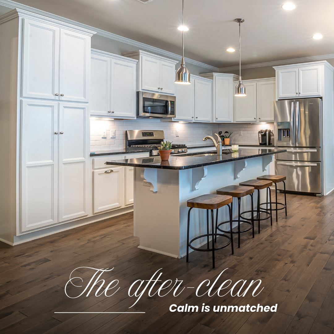 Kitchen bathroom bedrooms common rooms this standard clean. Dusting everything in the home cleaning countertops taking out trash cleaning tables and chairs cleaning inside and outside of the microwave stove burners stove tops panels clean and dry sink sweet mop floors clean countertops and backsplashes.