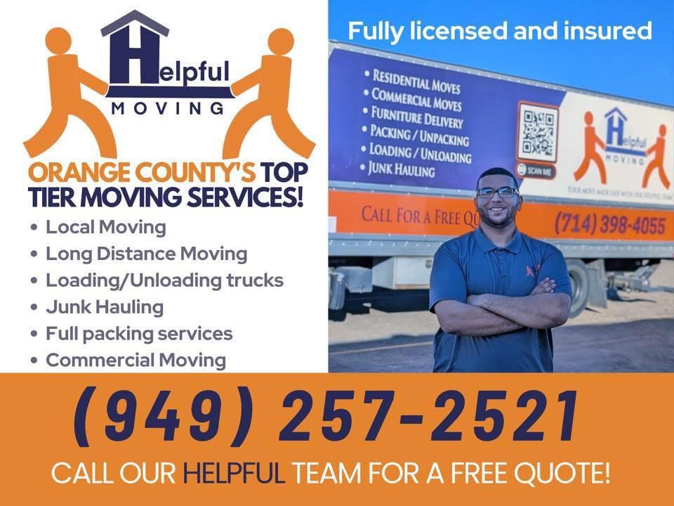Helpful Moving Inc offers fast, reliable, and affordable moving services across Orange County. Our licensed and insured team handles residential and commercial moves with care and efficiency. We proudly serve South OC cities including Mission Viejo, Laguna Niguel, Aliso Viejo, Dana Point, San Clemente, Lake Forest, and Rancho Santa Margarita. From packing to furniture assembly and same-day moves, we make relocation easy. Get in touch today for a free quote and experience stress-free moving with Helpful Moving Inc.