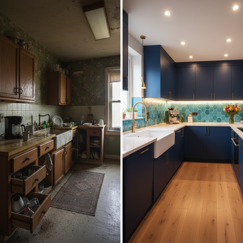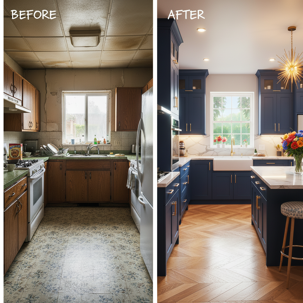 Transform your kitchen with new cabinets, to countertops, flooring, backsplash, lighting and layout changes.