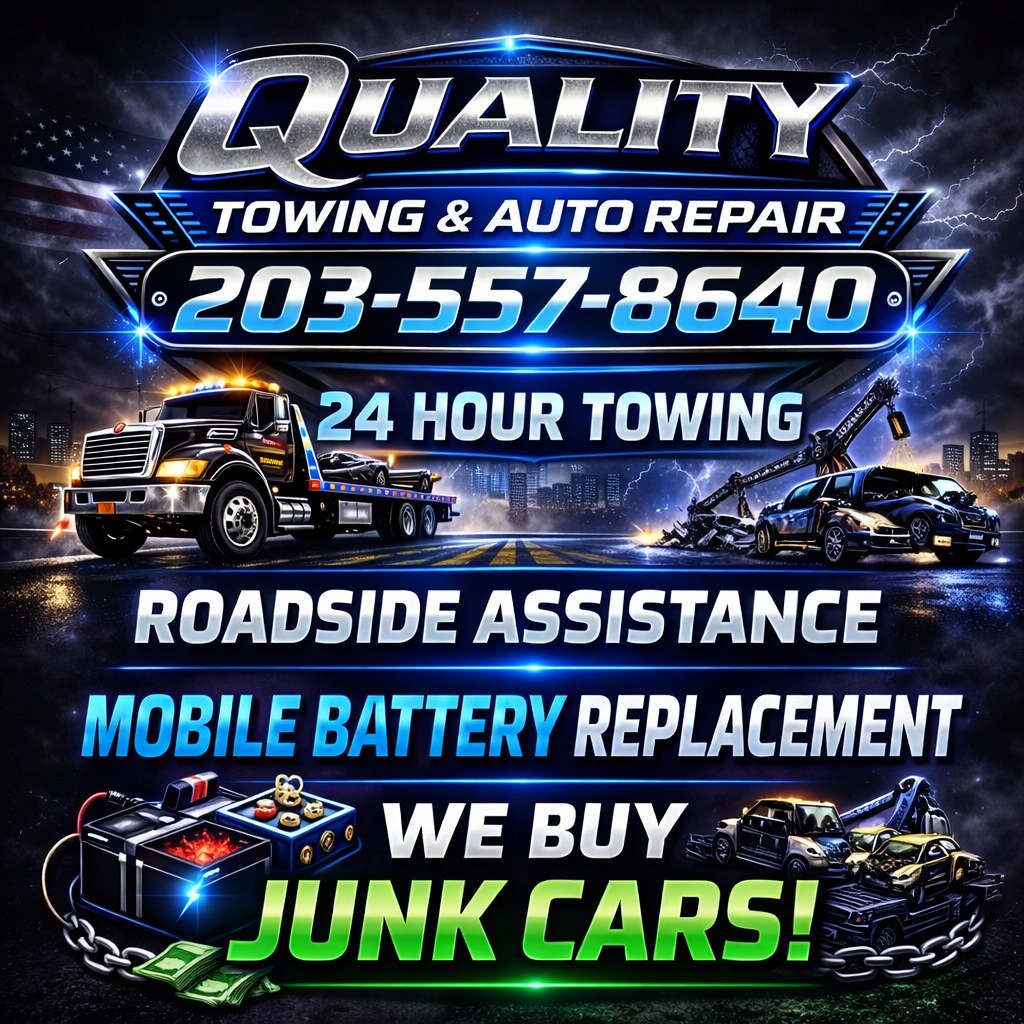 Quality Towing & Auto Repair in Westport, CT 06880 offers reliable towing and roadside assistance services you can count on. Whether you need a tow truck near you, winch out service, jumpstart, lockout help, or mobile battery service, our experienced team is ready 24/7. We specialize in light and medium duty wrecker services, flatbed towing, flat tire repair, and long distance towing. Plus, we buy junk cars, providing fair prices and hassle-free pickup. Choose Quality Towing & Auto Repair for fast, affordable, and professional towing near me in Westport!