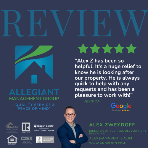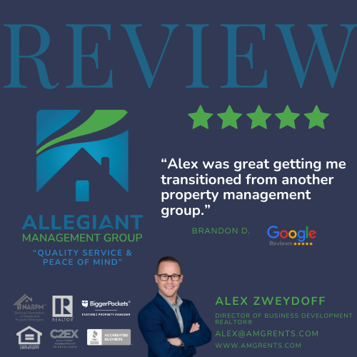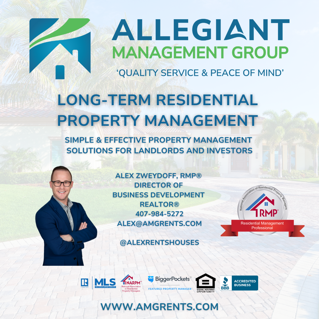 Alex Zweydoff is the Director of Business Development and a licensed REALTOR® at Allegiant Management Group, bringing over a decade of experience in property management and real estate in Central Florida. Since joining Allegiant in 2017, he has facilitated thousands of successful tenant placements and managed numerous rental properties for landlords and investors. Alex holds the RMP® designation from NARPM® and is actively involved in industry leadership (Florida REALTORS®, Osceola REALTORS®, NARPM®). He is passionate about legislative advocacy for real estate and price property right. Always ensuring his clients receive top-tier service and expertise.