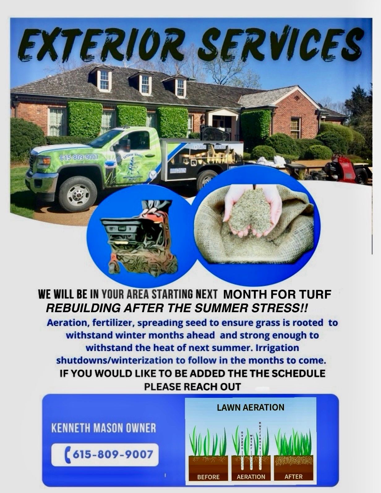 We will be in your area for turf rebuilding after the summer stress! Aeration, fertilizer, spreading seed to ensure grass is rooted to withstand winter months ahead and strong enough to withstand the heat of next summer. Irrigation shutdowns/winterization to follow in the months to come. if you would like to be added to the schedule, please reach out.