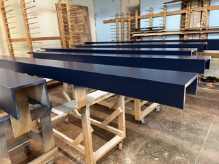 We finish stair railings both in the shop and onsite. Conversion varnish is used because of how durable and chemical resistant it is. Color matching is our specialty.