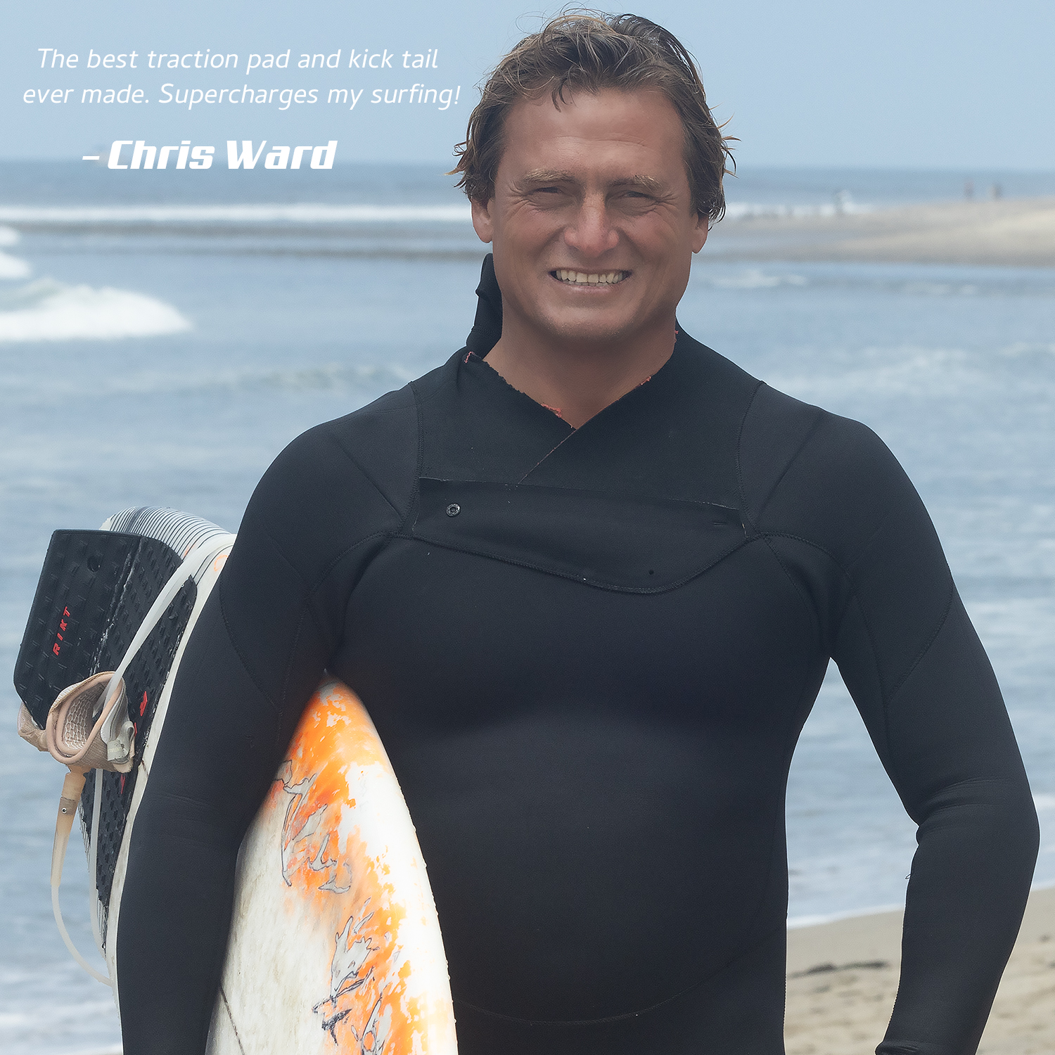 RIKT - Ramped Interchangeable Kick Tail for your surfboard with traction pads! Online company for surf accessories that are uniquely engineered to improve your surfing. In addition, have a look at the NEW surf apparel for sale! This kick tail has the same 33 degree ramp like all RIKT track pads with kick tails, is interchangeable but has super grippy traction pad material on the ramp! On top of that the arch support acts as a secondary grip that allows you to cup the bottom of your foot over it for even more connection to your board. Chris Ward liked this kick so much we decided to make it his signature kick. All of the RIKT kick tails with wax for grip work great, but this kick is definitely special!