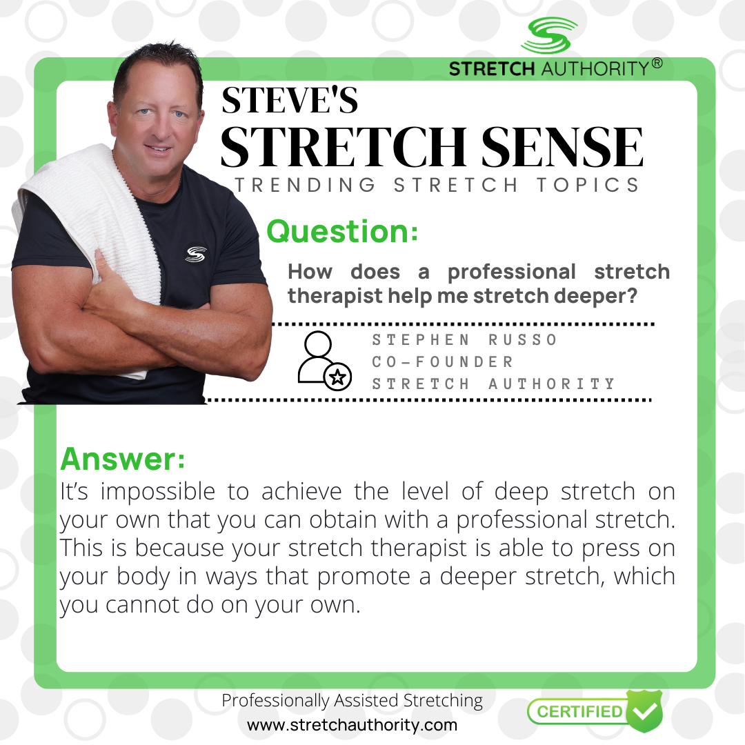 One-On-One Professionally Assisted Stretching We give you an amazing Head-To-Toe stretch for 30 minutes. We do all the work while you relax in our airy, ergonomic, hygienic, and state-of-the-art studios. You are stretched by our courteous, friendly, trained, and NASM-certified experts. You will leave feeling light, loose, and refreshed!