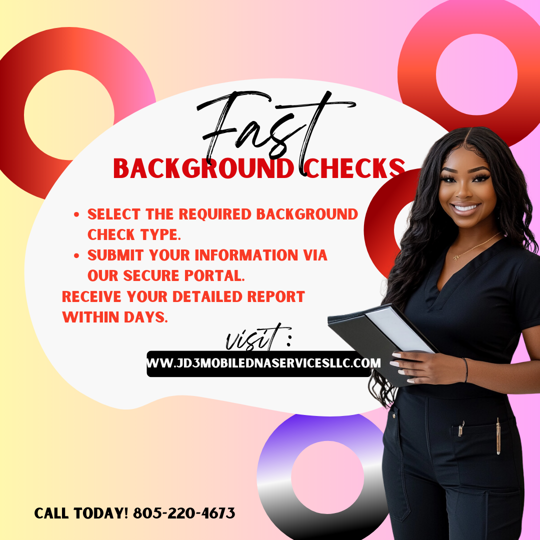 Here at JD3 Mobile DNA Services LLC we offer comprehensive and reliable solutions in DNA /Drug testing, Fingerprinting, Notary ,as well as Pre-employment verification services .NOW offering Occupational Health Screenings