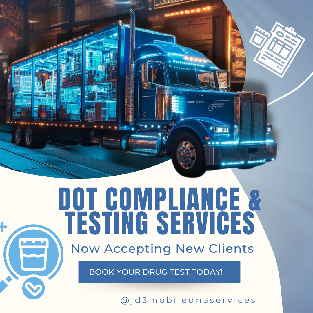As a DOT-regulated employer, compliance is not optional—it’s the law. JD3 DNA testing helps you meet all federal requirements under 49 CFR Part 40. Our certified collectors follow strict chain-of-custody procedures to ensure accuracy and legal defensibility of test results.