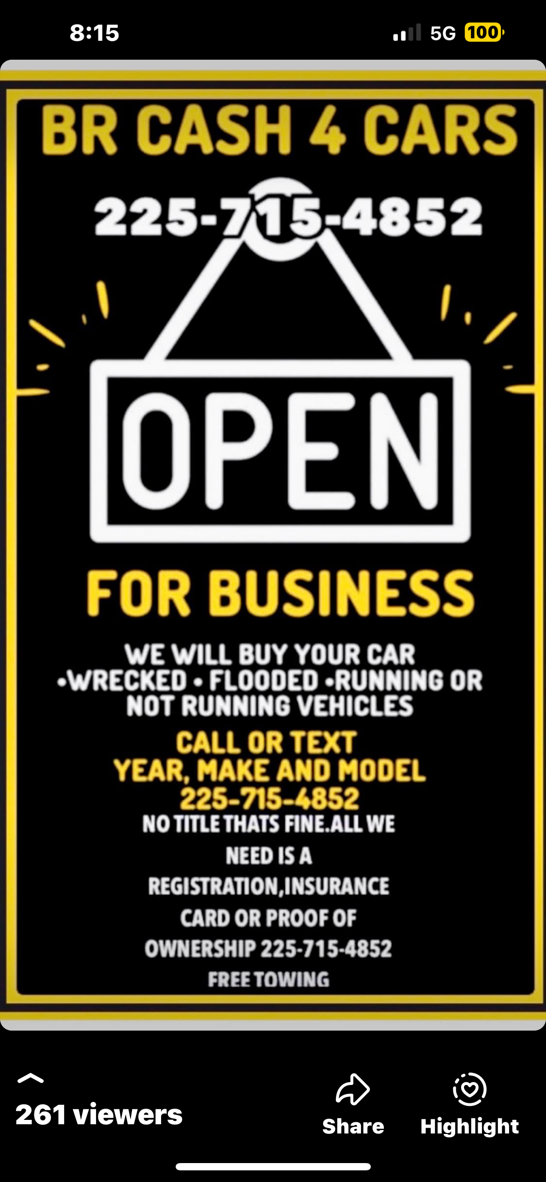 We pay cash for your unwanted Wrecked,Flooded,Non running & Running vehicles,boats,RVs,golf carts,motorcycles etc. Free towing 225-715-4852