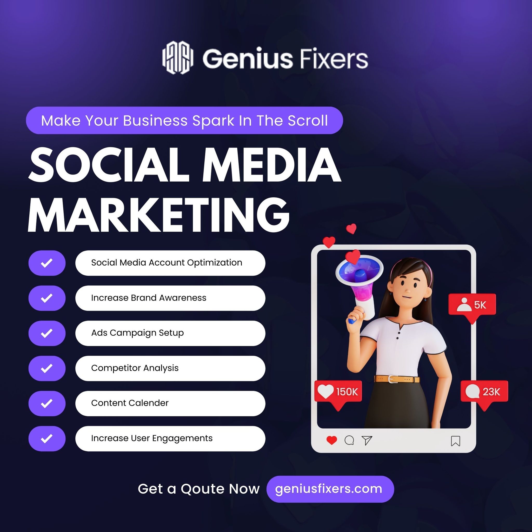 Genius Fixers offers comprehensive Social Media Marketing (SMM) services designed to boost your brand’s online presence and engagement. Our expert team crafts tailored strategies, including content creation, targeted advertising, and community management, to drive traffic, increase brand awareness, and generate leads. With a focus on data-driven results and innovative solutions, we help businesses thrive in the digital landscape, ensuring maximum ROI across platforms like Facebook, Instagram, LinkedIn, and more.