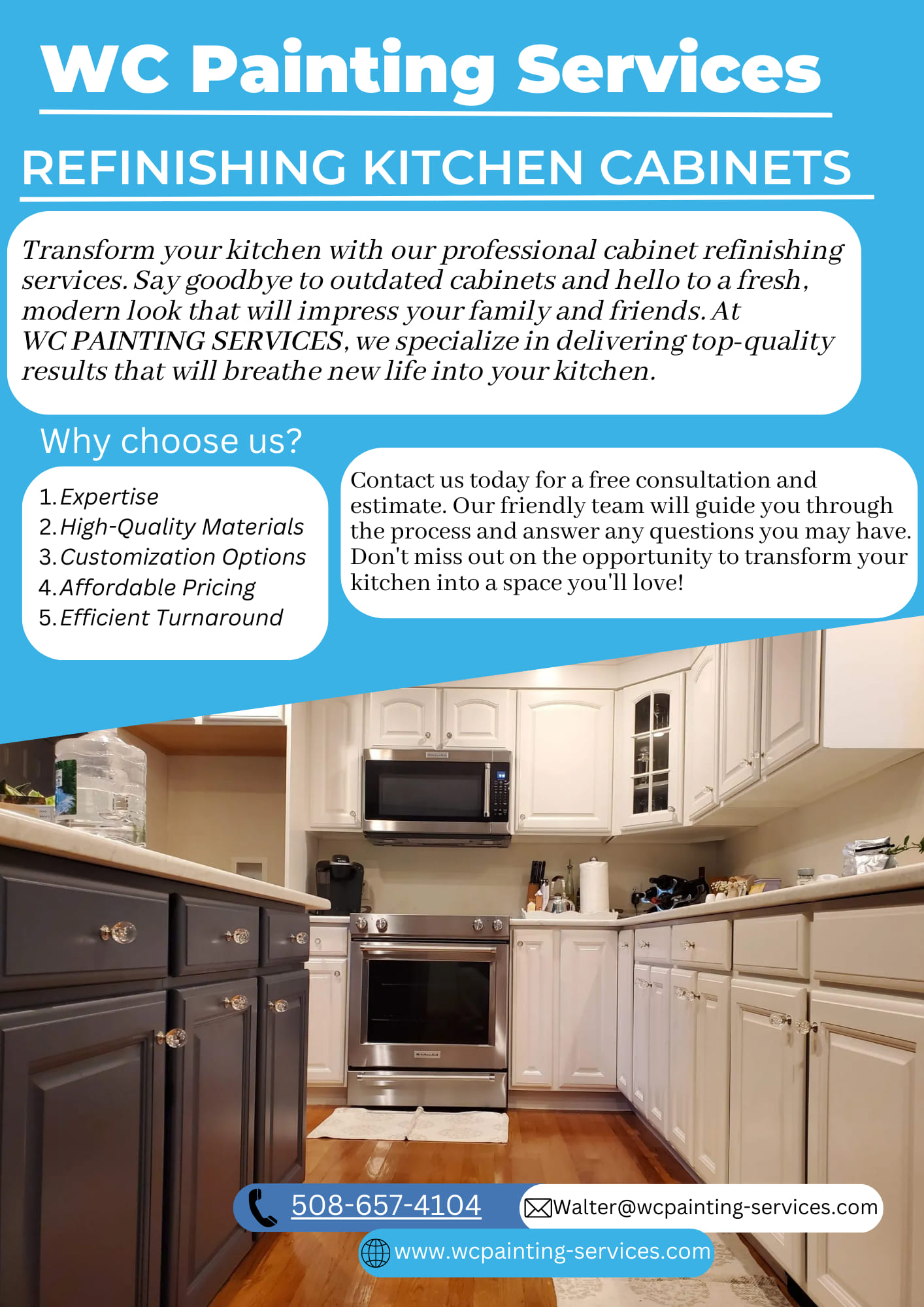 Local painting company w c painting out of Worcester massachusetts, offering kitchen cabinet refinishing.